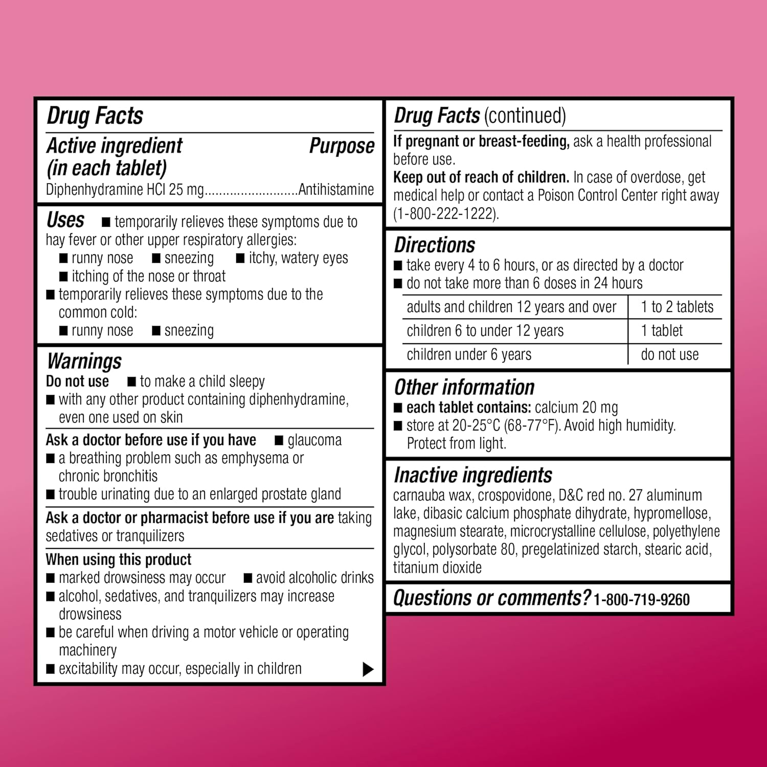 - ACTIVE INGREDIENT: These allergy relief tablets contain diphenhydramine HCl 25 mg, an antihistamine, which compares to the active ingredient in Benadryl Allergy Tablets
