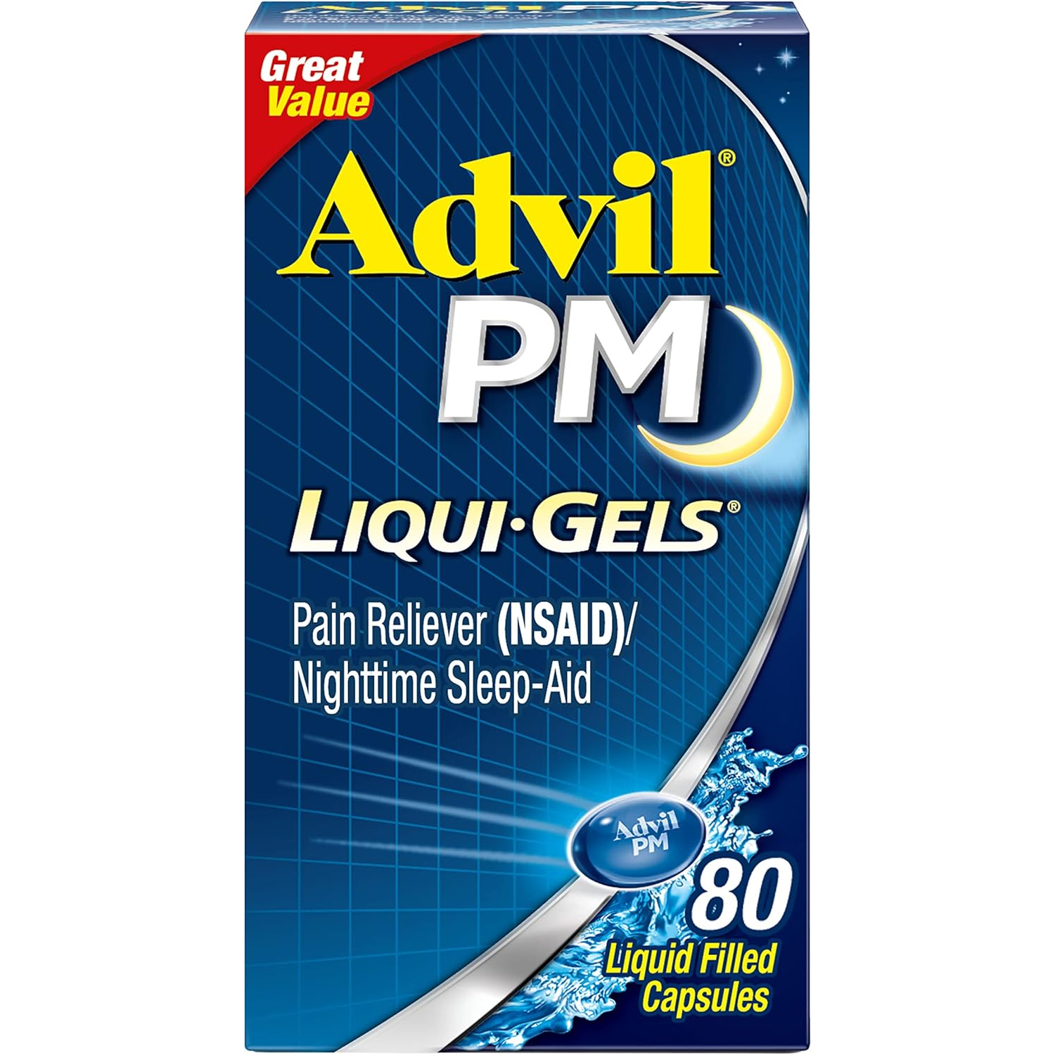 • One bottle of 80 liquid filled capsules of Advil PM Liqui-Gels Pain Reliever and Nighttime Sleep Aid, Pain Medicine with Ibuprofen for Pain Relief and Diphenhydramine HCL for a Sleep Aid