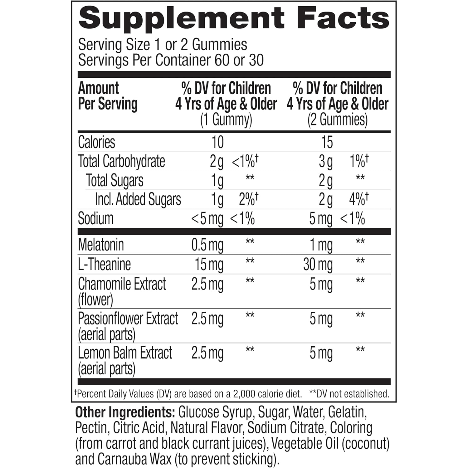 - THE GOODS INSIDE: Kids Sleep supplement gummies deliver a mild blend of Melatonin (0.5mg) to support healthy sleep cycles, including L-Theanine and a mix of traditionally used herbal helpers: Chamomile, Passionflower and Lemon Balm Extracts